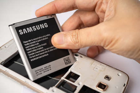 BANGKOK,THAILAND.JULY 1,2020 technician repairing and insert battery for Smartphone SAMSUNG.