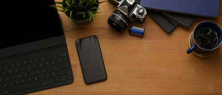 Top view of workspace with digital tablet, smartphone, camera, notebooks, coffee cup and copy space on wooden table