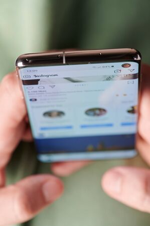New york, USA - july 22, 2019: Using instagram mobile app close up view, smartphone in hands