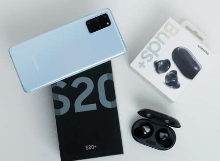 New york, USA - October 18, 2020: New Samsung galaxy s20 smartphone and earphones buds above top mview