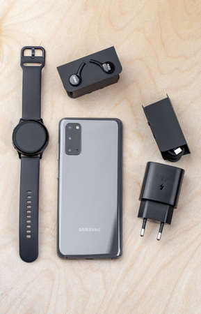 Rostov-on-Don, Russia - February 2020. SAMSUNG Galaxy S20 on a wooden background. The new SAMSUNG Galaxy S20 smartphone, Samsung Galaxy Watch Active2 and charger, cable, AKG headset close-up.