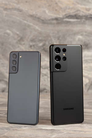 Rostov-on-Don, Russia - February 2021. Samsung Galaxy S21 and S21 Ultra 5G on a marble table. Close-up of new smartphones from Samsung.