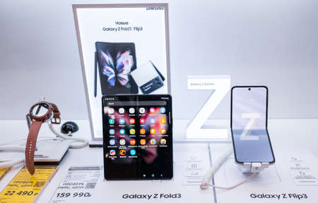 September 2, 2021, Moscow, Russia. New bendable smartphones from Samsung Galaxy Z Flip3 and Galaxy Z Fold 3 on a storefront.