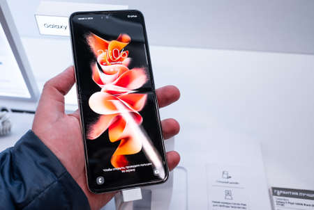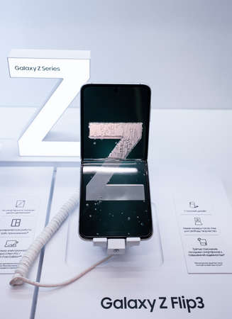 September 2, 2021, Moscow, Russia. New bendable smartphone from Samsung Galaxy Z Flip 3 on a storefront.