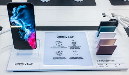 February 15, 2022, Moscow, Russia. The new Samsung Galaxy S22+ mobile phone in a store window.