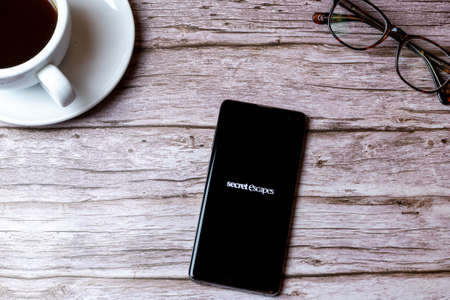 02-08-2021 Portsmouth, Hampshire, UK A mobile phone or cell phone laid on a wooden table with the Secret escapes app open next to a coffee and glasses
