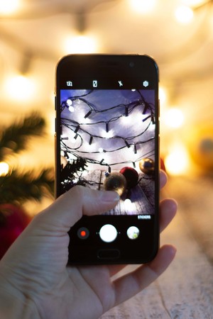 Hand holding mobile smart phone Taking photo with bokeh light background