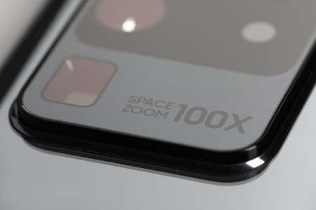 Minsk, Belarus - 19 March 2020 : Samsung galaxy s 20 ultra camera 100x module closeup. Illustrative editorial