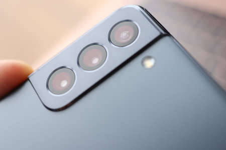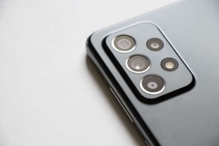 Ukraine Dnepr 08.04.2022 - New Samsung A52 smartphone and camera on the phone, macro photo of lenses