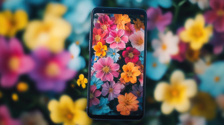 A vibrant smartphone showcases a stunning display of colorful floral patterns, blending technology with the beauty of nature. Perfect for artistic inspiration.