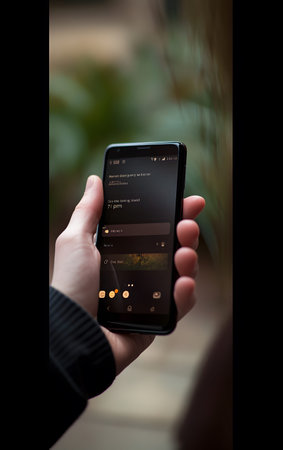 A hand holding a smartphone with a dark screen, showcasing modern technology and digital interaction in a natural setting.