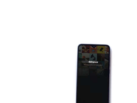 Lod, Israel - July 8, 2020: Adobe Behance app launch screen with logo on the display of a black mobile smartphone isolated on white background. Top view flat lay with copy space.