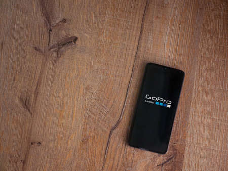 Lod, Israel - July 8, 2020: GoPro - Video Editor and Movie Maker app launch screen with logo on the display of a black mobile smartphone on wooden background. Top view flat lay with copy space.