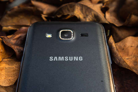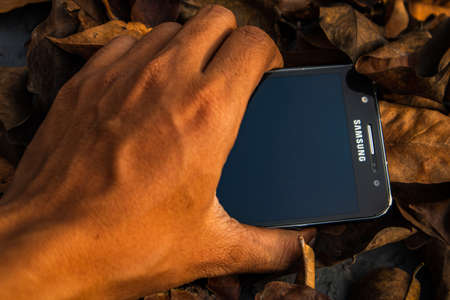 bogor,indonesia - 07 july 2021 : samsung mobile on a pile of dry leaves with morning light