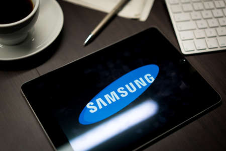 New York, New York / USA - 11 11 2019: Logo of Samsung on the iPad Air2 in on office desk