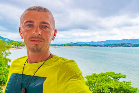 Tourist traveler backpacker on Koh Samui island in Surat Thani Thailand and panoramic view of turquoise water beach on gloomy storm clouds on rainy day.