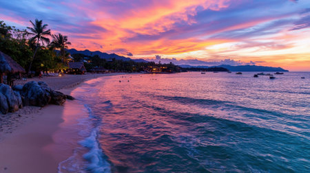 A stunning sunset lights up the sky in vibrant colors over a peaceful beach. The gentle waves lap at the shore, while palm trees sway softly in the breeze.
