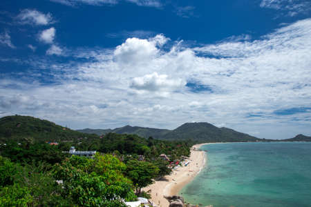 Beautiful aerial view of beach and sea with many tree and white cloud on blue sky in koh samui island for vacation and travel