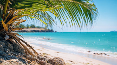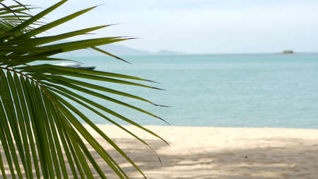 Tropical sandy beach of paradise island. Green palm leaf overlooking sea. Soft focus blurred natural abstract background with copy space and bokeh. Travel, tourism and summer vacation concept