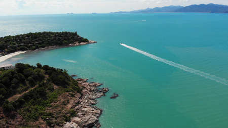 Beautiful ocean with track on water. Breathtaking aerial view of rocks, turquoise water and jet ski crossing ocean in Thailand. Drone view