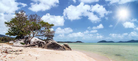 Tropical beach and blue sky background ona Rocky beach landscape on summer day, Beautiful turquoise color sea water. Travel holiday