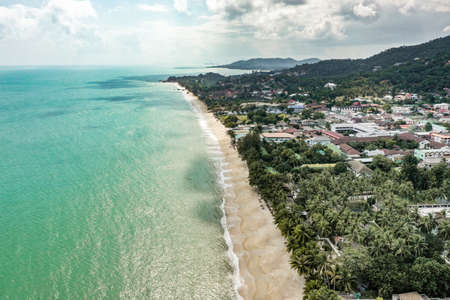 Sea view at Chaweng beach in Koh Samui, Thailand. The scenery of seascape and bay with city and forest of coconut trees in aerial view on summer day.
