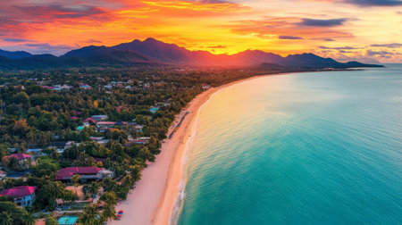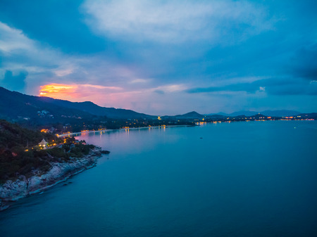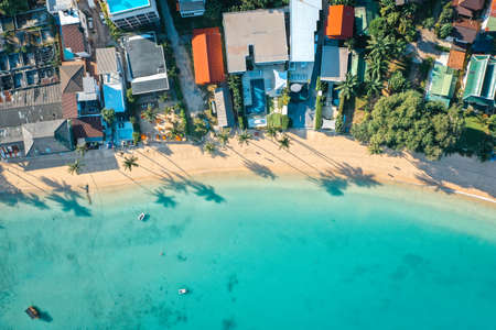 Aerial view of beautiful tropical beach and sea with palm and other tree in koh samui island Thailand at sunset time for vacation and travel