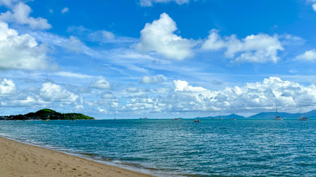 Beautiful seascape with blue sky and white clouds on the beach, Tranquil Tropical Shoreline with Clear Waters and Soft Sand