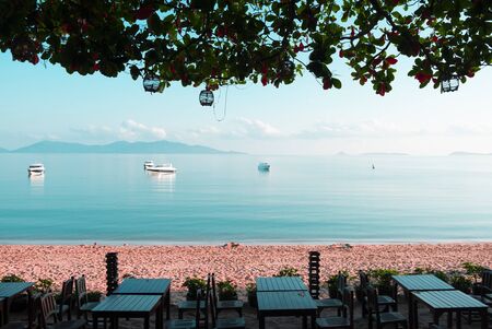 Pink and blue colours. Beautiful tropical beach with view of cafe tables and white yachts in the sea, Thailand, Koh Samui.