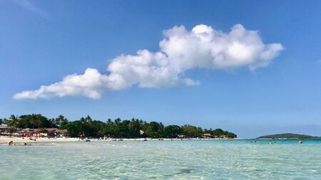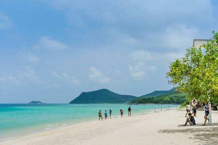 CHON BURI THAILAND - APRIL 19 : Unidentified tourists relax and swim at the beach of Samae San islands (Koh Samae San) on April 19,2019 in Sattahip, Chon Buri, Thailand