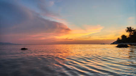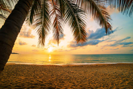 Beautiful Silhouette coconut palm tree on the tropical beach. Bright colorful sunset sky over the ocean water, Thailand.