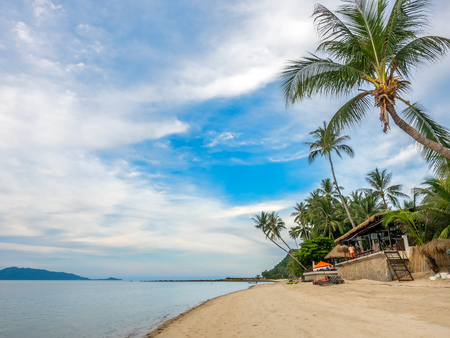 Amazing Koh Samui island palm beach and landscape panorama with view on Koh Pha-ngan in Thailand.
