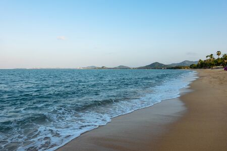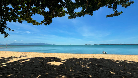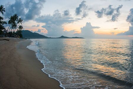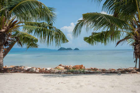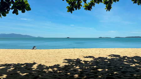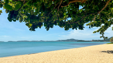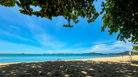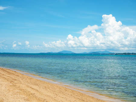 Breathtaking scenery the sand shore of the calm ocean and the beach surrounded by the tropical plants in the exotic island. Kingdom of Thailand. Perfect background for the illustrations and collages.