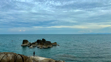 Natural small granite rock formation at sea in the afternoon, Belitung Island Indonesia.