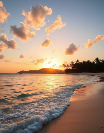 A breathtaking view of a tranquil coastline with turquoise waters, golden sand, and lush palm trees under a bright blue sky, perfect for relaxation.