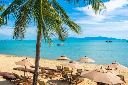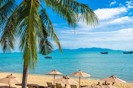 Beautiful tropical beach sea and ocean with coconut palm tree and umbrella and chair on blue sky and white cloud for holiday vacation travel