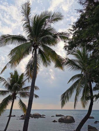 Seascape view with tall coconut tree under twilight evening cloud blue sky in summer season at Samui island, Thailand