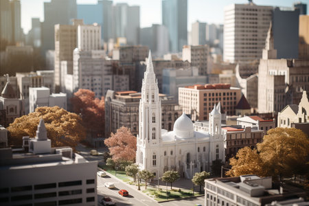 This stunning aerial image features a historic church juxtaposed against a modern skyline, showcasing the harmony of old and new in urban life.