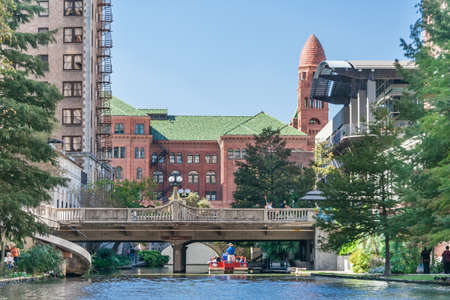 San Antonio River Walk near Alamo between E Crockett St and E Commerce St in downtown San Antonio, Texas, USA.