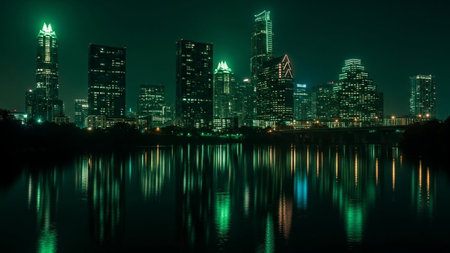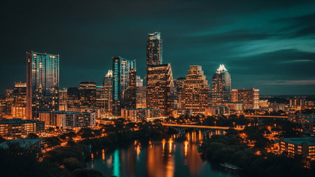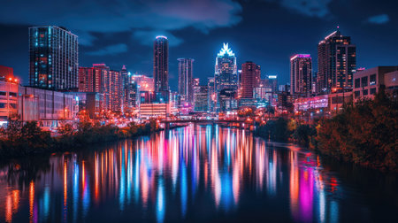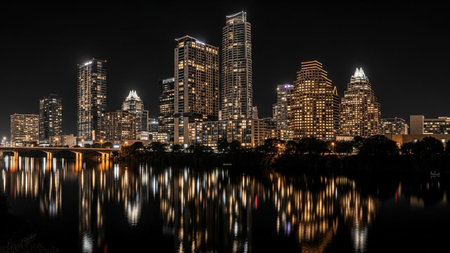 A nighttime captures the vibrant Austin skyline. Numerous illuminated skyscrapers pierce the dark sky, their windows glowing with warm light. The city lights are beautifully reflected in the calm surface of the river in the foreground, creating a mirror of the urban spectacle. Trees line the riverbank, adding a touch of nature to the metropolitan scene. The overall mood is one of awe and the energetic pulse of a modern city after dark.