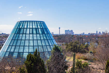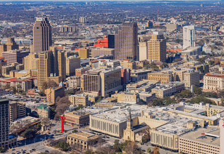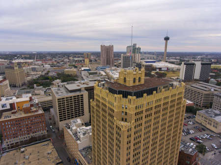 Aerial view of San Antonio downtown skyline including Tower Life Building, San Antonio, Texas, TX, USA.