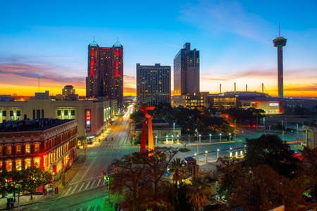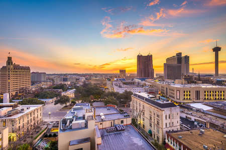 San Antonio city skyline including Hotel Contessa, Westing Riverwalk, Drury Plaza Hotel and Tower Life Building at sunrise in downtown San Antonio, Texas, USA.