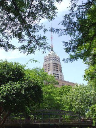 Old Tall Tower Life Building Bridge Restaurants Sidewalks Tourists Reflection River Walk San Antonio Texas. 15 Mile River Walk created in the 1960s to deal with flood problem.