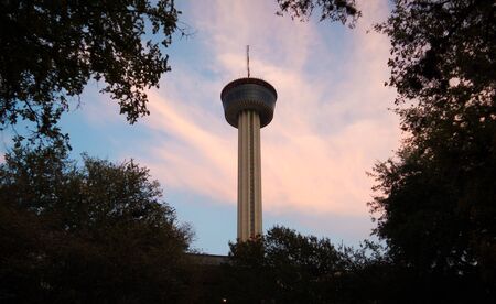 Tower in San Antonio, Texas through trees in front of beautiful pink sunset sky and clouds in background. No people, copy text space