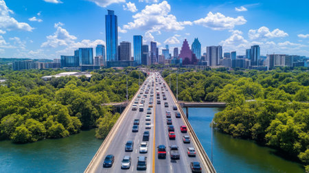 Aerial view of a busy city highway with flowing traffic, surrounded by lush greenery and a vibrant skyline under a bright blue sky. Perfect for urban themes.