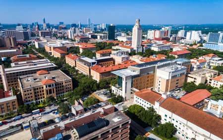 Austin Texas drone view over entire cityscape downtown views with UT Tower and entire university with Downtown Skyline in the background in a sunny morning in the capital city
