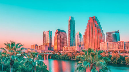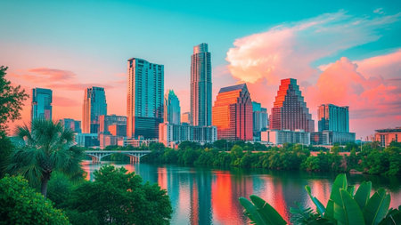 A panoramic view of the Austin, Texas skyline at sunset. The sky is a vibrant gradient of pink and blue, with soft clouds reflecting the warm hues of the setting sun. Tall modern skyscrapers dominate the cityscape, their windows catching the light. A calm river flows in the foreground, mirroring the colorful sky and the urban landscape. Lush green trees and palm trees line the riverbanks, adding a touch of nature to the urban scene. A bridge is visible in the distance, connecting parts of...
