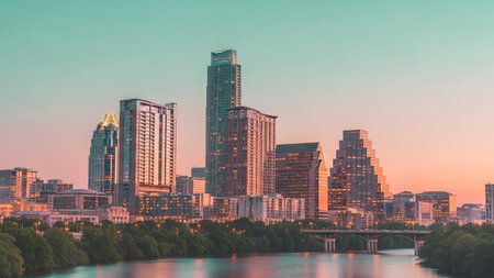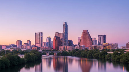 A panoramic view of the Austin, Texas skyline at sunset. Tall modern skyscrapers dominate the horizon, their lights beginning to twinkle as dusk settles. A calm river flows in the foreground, reflecting the vibrant colors of the sky and the city lights. Lush green trees line the riverbanks, contrasting with the urban architecture. The sky is a canvas of soft pinks, oranges, and teals, creating a peaceful and picturesque atmosphere. captures the essence of a modern, dynamic city at the close...