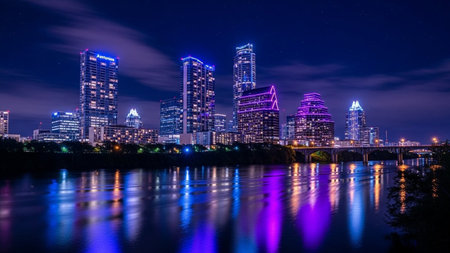 A nighttime view of the Austin, Texas skyline showcases a collection of modern skyscrapers illuminated with vibrant blue and orange lights. The city lights are beautifully reflected in the dark, calm water of the lake or river in the foreground, creating a symmetrical and visual. A bridge spans across the water, adding depth to the urban landscape. The dark night sky above is dotted with a few faint stars, enhancing the magical atmosphere of the illuminated city.