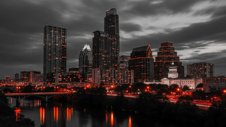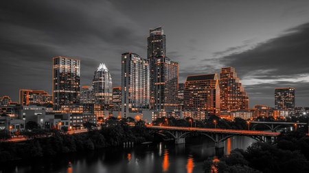 The Austin, Texas skyline is dramatically presented at dusk, with a striking contrast between the dark, moody sky and the illuminated buildings. A vibrant orange glow emanates from many of the structures and streetlights, casting a warm hue across the scene. The city's reflection shimmers on the dark water of the river below, and a bridge spans across, adding a layer of urban infrastructure. The overall impression is one of a dynamic and glowing metropolis.